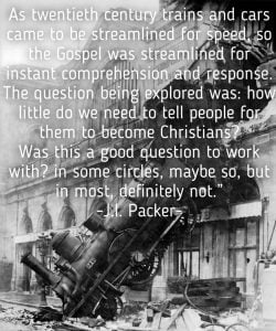 “As twentieth century trains and cars came to be streamlined for speed, so the Gospel was streamlined for instant comprehension and response. The question being explored was: how little do we need to tell people for them to become Christians? Was this a good question to work with? in some circles, maybe so, but in mose, definitely not.” – J.I. Packer, Affirming the Apostles Creed