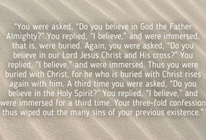 In his book, “I Believe”, Alistair McGrath points out gives a quotation of a sermon from the Fourth Century that was given to those who had just been baptized. Throughout the quotation, the preacher is quoting the Apostles’ Creed.